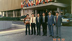 3月,广州市华南橡胶轮胎有限公司率先引进美国费尔斯通子午线轮胎技术,成为国内第一家全套引进美国FIRESTONE子午线轮胎技术的企业。次年派员前往费尔斯通意大利罗马国际技术中心巴里轮胎厂培训学习。图为外派培训人员在ITC大楼前留影"