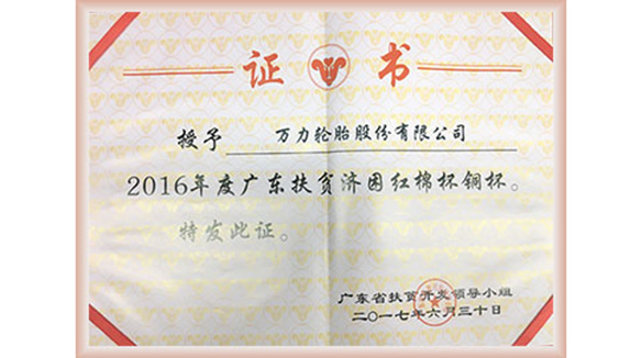 万力股份对口扶贫村----英德市清溪村,公司认真贯彻落实上级“精准扶贫”工作,引导贫困户转变等、靠、要的落后思想,带领贫困户自主“造血”得到了贫困户和群众的认可。万力轮胎凭借2016年对广东扶贫济困事业的突出贡献被授予“广东扶贫济困红棉杯铜杯奖”。
